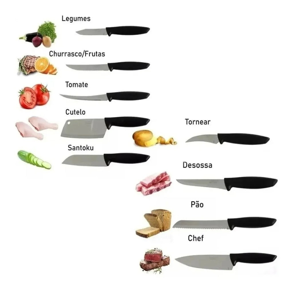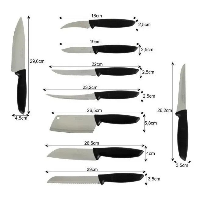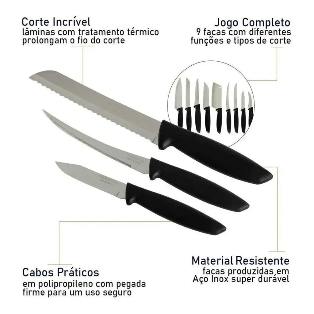Com o Jogo de Facas Tramontina Plenus com Lâminas em Aço Inox e Cabos de Polipropileno Preto 9 Peças, você terá a solução completa de facas para utilizar nos mais diversos tipos de cortes e ocasiões gastronômicas.